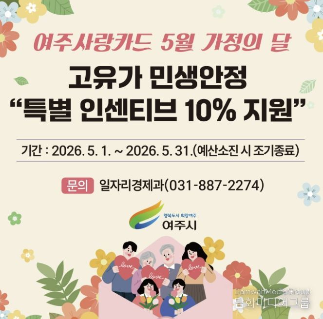 시민행정신문 강갑수 기자 | 여주시는 최근 중동 정세 악화에 따른 물가상승 압력이 높아짐에 따라 민생안정 대책으로 오는 5월 가정의 달 ‘여주사랑카드 특별 인센티브 10%’ 지원을 한다고 밝혔다.