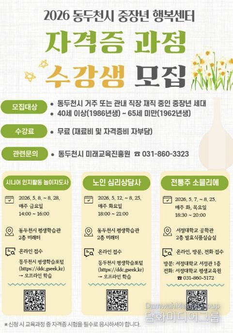 시민행정신문 강갑수 기자 | 동두천시 미래교육진흥원은 지역 내 중장년층의 성공적인 인생 2막과 안정적인 사회 참여를 지원하기 위해 ‘2026년 중장년 행복센터 자격증 과정’ 수강생을 모집한다고 밝혔다.