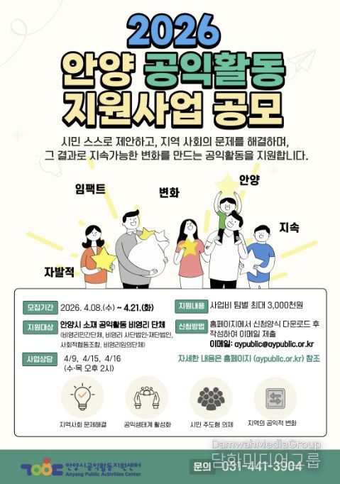 시민행정신문 강갑수 기자 | 안양시공익활동지원센터는 지역의 문제를 창의적으로 해결하고 실질적인 사회적 변화를 만들어 갈 비영리단체 및 시민 모임을 모집한다고 10일 밝혔다. 이번 공모는 시민 주도의 공익 생태계를 구축하기 위해 ‘공익활동 지원사업’과 ‘커뮤니티기반 공익활동 협력사업’의 두 가지 트랙으로 운영된다.