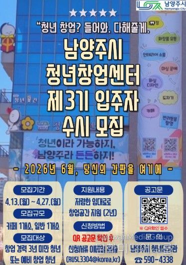 시민행정신문 이세훈 기자 | 남양주시는 오는 13일부터 청년 창업가들이 안정적으로 창업에 도전할 수 있도록 제3기 청년창업센터 입주자를 수시 모집한다고 밝혔다.