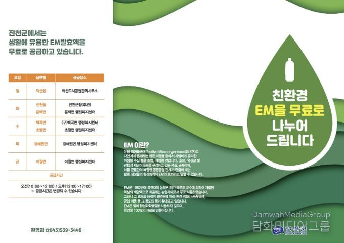 시민행정신문 강갑수 기자 | 충북 진천군은 4월부터 악취 제거와 수질 정화에 효과가 있는 친환경 EM 발효액을 무상으로 보급하고 있다고 13일 밝혔다.