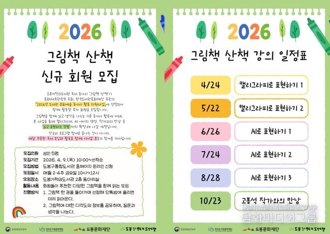 시민행정신문 강갑수 기자 | 서울 도봉구 도봉기적의도서관이 독서동아리 ‘그림책 산책’을 확대 운영한다. ‘그림책 산책’은 그림책을 함께 읽고 이야기를 나누는 성인 독서 동아리다. 앞서 도서관은 문화체육관광부와 한국도서관문화재단이 추진하는 녪년 도서관 문화예술 동아리 활동 지원사업’에 선정됐다.