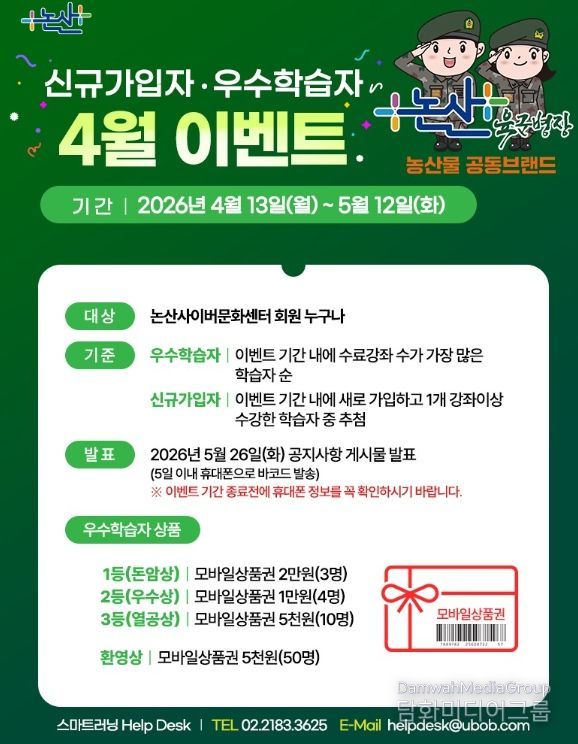 이번 이벤트는 4월 13일부터 5월 12일까지 진행되며, 논산시 사이버문화센터 회원이라면 누구나 참여할 수 있다.