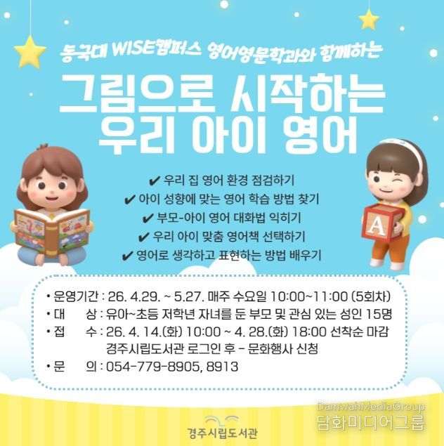 시민행정신문 기자 | 경주시 시립도서관은 지역대학과의 협업을 통해 시민들에게 실생활 중심의 영어교육 기회를 제공하고자 동국대학교 WISE캠퍼스 영어영문학과와 함께 ‘그림책으로 시작하는 우리 아이 영어’ 강좌를 운영한다.