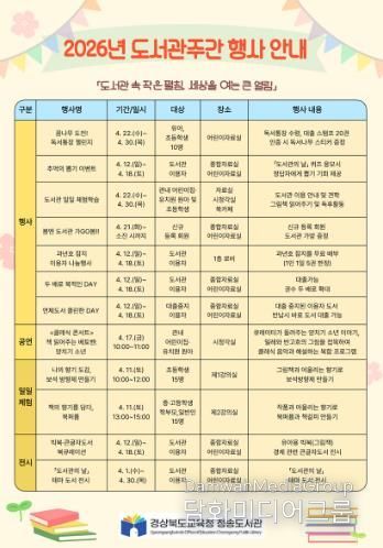 시민행정신문 기자 | 경상북도교육청 청송도서관이 2026년 4월 도서관주간을 맞이하여 ‘도서관 속 작은 펼침, 세상을 여는 큰 열림’을 주제로 다양한 독서·문화 프로그램을 운영한다.