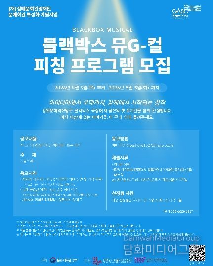 시민행정신문 기자 | (재)김해문화관광재단(대표이사 최석철) 김해문화의전당은 2026 문예회관 특성화 지원사업의 일환으로 ‘블랙박스 뮤G컬’ 피칭 프로그램을 운영하고 창작뮤지컬 초연으로 이어지는 30분 리딩 쇼케이스의 작품 공모를 진행한다.