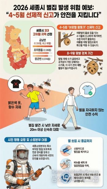 시민행정신문 강갑수 기자 | 세종특별자치시 소방본부가 벌 쏘임 사고를 사전 예방하기 위해 '2026년 벌집 발생 위험 예측지도’를 제작·배포했다고 14일 밝혔다.