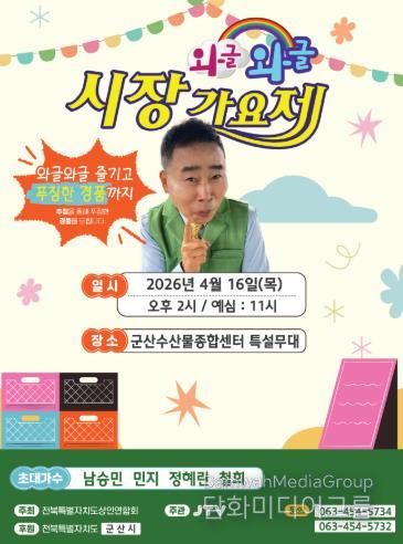 시민행정신문 강갑수 기자 | 군산시가 전통시장에 활력을 불어넣고 시민과 상인이 함께 어우러지는 문화의 장을 마련하고자 ‘와글와글 시장가요제’를 오는 4월 16일 오후 2시, 군산수산물종합센터 신축 건어동 앞 광장에서 개최한다.