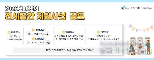 시민행정신문 강갑수 기자 | 세종시문화관광재단은 지역 시각예술인의 창작활동을 지원하고 시민들에게 다양한 전시 관람 기회를 제공하기 위해 ‘2026년 하반기 전시공간 지원사업 공모’를 진행한다.