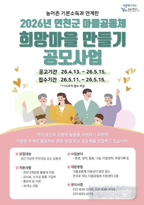 시민행정신문 강갑수 기자 | 연천군 마을공동체지원센터가 농어촌기본소득과 연계한 ‘2026년 희망마을 만들기 주민공모사업’ 참여 공동체를 모집한다.