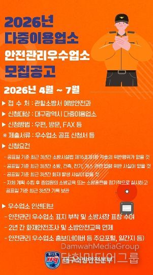 시민행정신문 강갑수 기자 | 대구소방안전본부는 시민들이 안심하고 이용할 수 있는 환경을 조성하고, 영업주의 자율적인 안전관리 의식을 높이기 위해 ‘2026년 다중이용업소 안전관리 우수업소’ 신청을 접수한다.