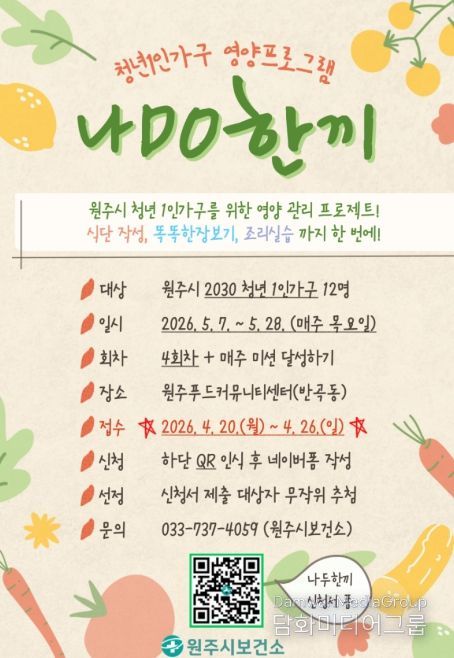 시민행정신문 기자 | 원주시보건소는 관내 2030 청년 1인 가구의 건강한 식생활 자립을 위한 영양관리 프로그램 ‘나DO한끼’ 참여자를 모집한다.