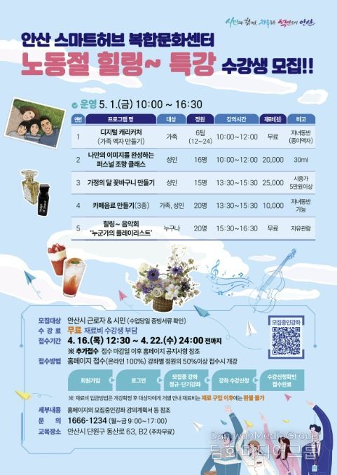수강 신청은 오는 16일부터 선착순으로 접수한다. 프로그램 내용과 신청 방법 등 자세한 사항은 안산 스마트허브복합문화센터 누리집을 참고하거나 전화로 문의하면 안내받을 수 있다. 수강료는 전액 무료다.
