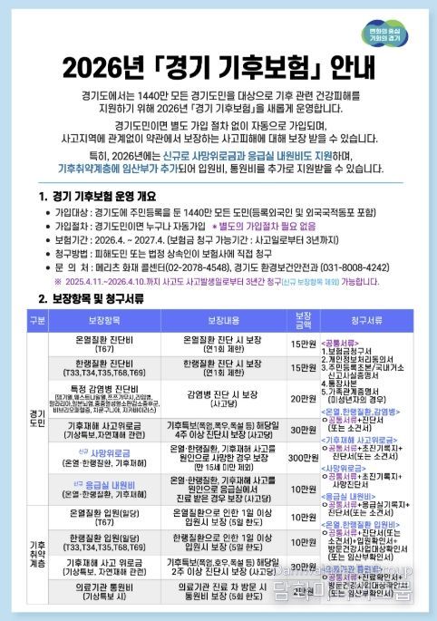 ‘경기 기후보험’은 동두천 시민을 포함해 경기도에 주민등록을 둔 도민이라면 별도 가입 절차 없이 자동으로 가입되며, 폭염과 한파 등 기후재난으로 인한 피해를 보장하는 제도다. 특히 사고 발생 지역과 관계없이 약관상 보장 범위에 해당하면 보험 혜택을 받을 수 있다는 점이 특징이다.