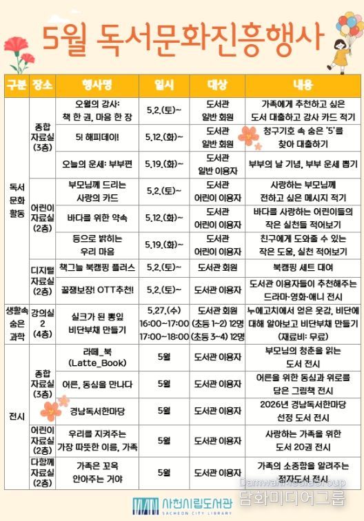 시민행정신문 강갑수 기자 | 사천시립도서관은 가정의 달을 맞아 가족의 의미를 되새기고 시민들의 자발적인 독서 참여를 유도하기 위한 ‘5월 독서문화진흥행사’를 운영한다.
