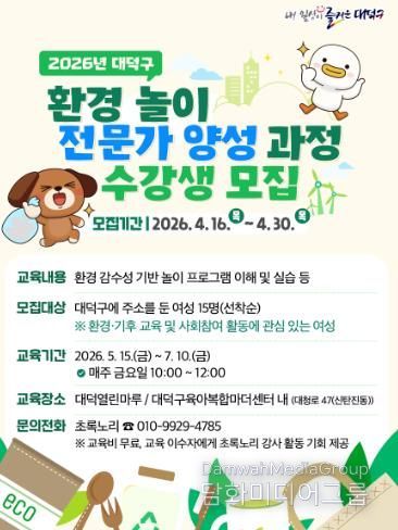 시민행정신문 강갑수 기자 | 대덕구는 지역 내 환경교육 활성화와 여성 일자리 창출을 위해 ‘환경 놀이 전문가 양성과정’을 운영하고 참여자를 모집한다.