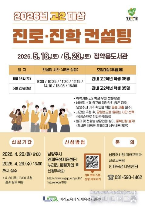 시민행정신문 강갑수 기자 | 남양주시는 오는 20일부터 29일 오후 1시까지 관내 고등학교 2학년 학생과 학부모를 대상으로 ‘고2 맞춤형 진로·진학 컨설팅’ 참여자를 모집한다고 15일 밝혔다.
