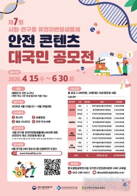 시민행정신문 강갑수 기자 | 과학기술정보통신부는 시험·연구용 유전자변형생물체(LMO)에 대한 국민의 이해를 높이고 생물안전문화를 확산하기 위해 4월 15일부터 6월 30일까지 '시험·연구용 LMO 안전 콘텐츠 대국민 공모전'을 개최한다고 밝혔다.