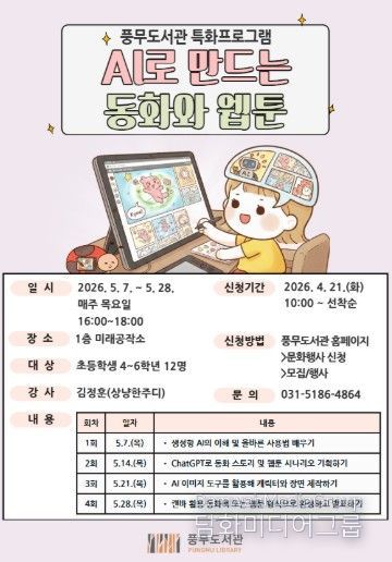 시민행정신문 기자 | 김포시 풍무도서관은 가정의 달을 맞아 초등학생 4~6학년을 대상으로 ‘인공지능(AI)으로 만드는 동화와 웹툰’을 오는 5월 7일부터 28일까지 매주 목요일 오후 4시부터 6시까지 총 4회에 걸쳐 운영한다.