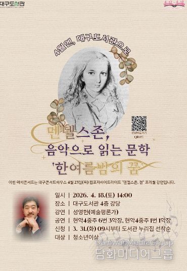 시민행정신문 강갑수 기자 | 대구도서관은 4월 도서관 주간을 맞아 대구콘서트하우스와 협업해 특별 렉처콘서트 ‘멘델스존 음악으로 읽는 문학’을 4월 18일 오후 2시에 개최한다.