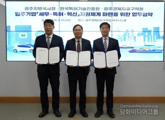 시민행정신문 강갑수 기자 | 광주경제자유구역청은 15일 경자청 비즈니스룸에서 광주지방국세청, (재)한국특허기술진흥원과 ‘광주경제자유구역 핵심 전략산업 기업 육성 및 기술 경쟁력 강화를 위한 업무협약’을 체결했다.