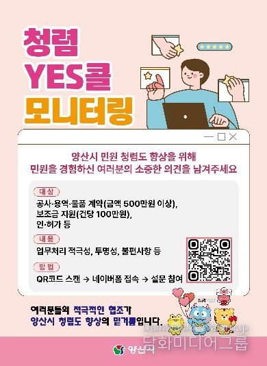 양산시 관계자는 “부패 취약 업무 민원처리 과정에서 겪었던 불편 사항과 문제점을 적극적으로 알려주시길 바란다”며 “청렴 모니터링을 통해 개선 의견을 수렴하고 부조리 요인을 사전에 점검해 비위행위 예방과 민원 만족도 제고를 통해 외부 청렴도 향상에 노력하겠다”고 밝혔다.