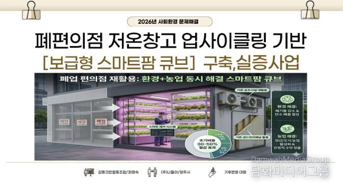 선정된 사업은 ‘폐편의점 저온창고 업사이클링 기반 보급형 스마트팜 큐브 구축·실증사업’이다. 폐기되는 냉장·공조설비를 재활용해 스마트팜 구축비용을 30~50% 절감하고, 이를 스마트팜 인프라로 전환하는 순환경제 모델로 사업비 3천만 원을 지원받게 된다.