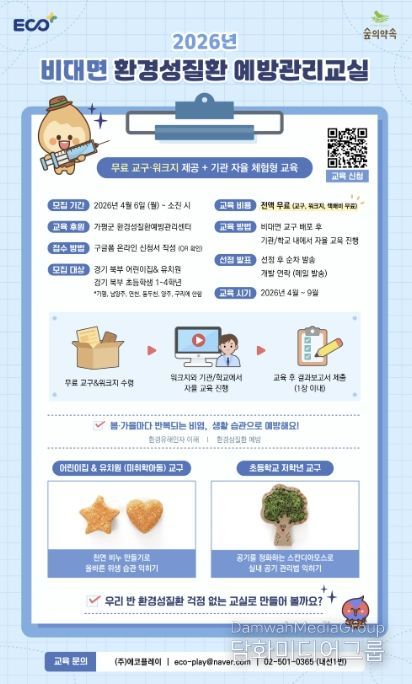 시민행정신문 강갑수 기자 | 가평군 환경성질환예방관리센터 ‘숲의 약속’이 어린이들의 건강한 생활 습관 형성을 돕기 위해 ‘2026년 비대면 환경성질환 예방관리교실’ 참여 기관을 모집한다.