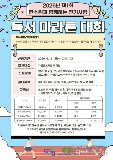 군은 지난 7일 양 기관의 업무협약 체결 이후, 13일부터 군민들의 높은 관심 속에 전기사랑 독서마라톤이 펼쳐지고 있다고 밝혔다. 이번 대회는 가평군도서관이 한수원 공모사업에 선정돼 확보한 5,000만 원의 사업비를 투입해 운영된다. 현재 참가 신청을 가평군도서관 홈페이지를 통해 받고 있다.