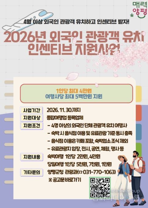 시민행정신문 강갑수 기자 | 양평군은 외국인 관광객 유치를 촉진하고 침체된 지역 관광산업에 활력을 불어넣기 위해 ‘2026년 양평군 외국인 관광객 유치 인센티브 지원사업’을 추진한다고 밝혔다.