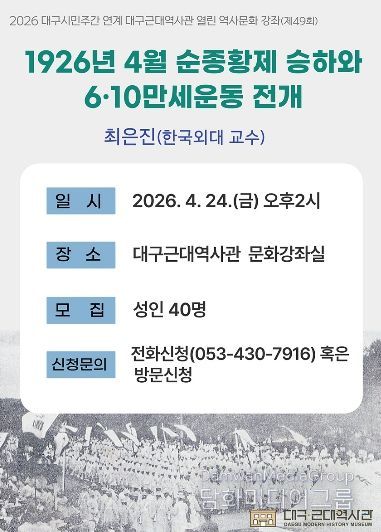 시민행정신문 강갑수 기자 | 대구문화예술진흥원 박물관운영본부 소속 대구근대역사관은 2026년 대구시민주간 연계행사로 4월 24일 오후 2시에 ‘1926년 4월 순종황제 승하와 6·10만세운동 전개’를 주제로 전문가 특강을 개최한다.