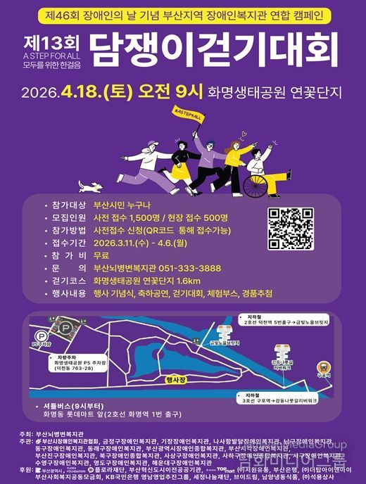 시민행정신문 기자 | 부산시는 장애인의 날(4.20.)을 맞이해 내일(18일) 오전 9시 화명생태공원에서 '제13회 담쟁이 걷기대회'가 열린다고 밝혔다.