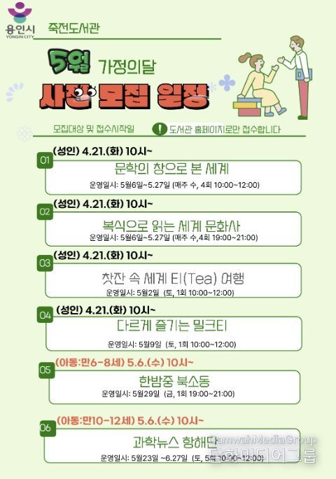 시민행정신문 강갑수 기자 | 용인특례시 죽전도서관은 오는 5월 가정의 달을 맞아 ‘2026년 5월 독서문화행사’를 개최한다.