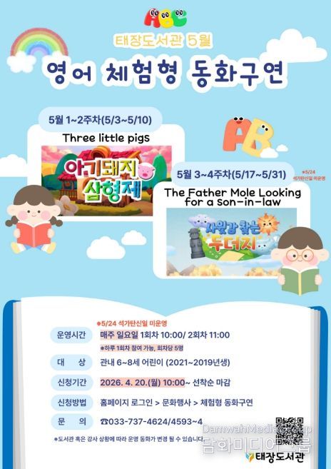 5월에는 ▲아기 돼지 삼형제(Three little pigs) ▲사윗감 찾는 두더지(The father mole looking for a son-in-law) 등 아이들에게 친숙하고 사랑받는 동화를 준비했다. 매주 일요일 오전 10시와 11시 2회차로 운영되며, 참가비는 무료다.