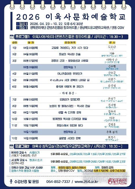 시민행정신문 강갑수 기자 | 안동시 이육사문학관은 4월 23일부터 '2026 이육사문화예술학교'를 개강한다. '2026 이육사문화예술학교'는 국내외 저명 강사들이 참여해 인문․예술 전반의 다양한 주제를 다루며, 시민이 일상에서 인문학의 깊이를 체감할 수 있도록 풍성하고 내실 있는 강연으로 운영된다.