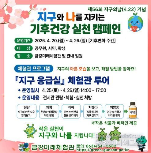 시민행정신문 강갑수 기자 | 군산시는 제56회 지구의 날(4월 22일)과 기후변화주간을 맞아 시민들의 기후위기 대응 참여를 유도하기 위해 4월 20일부터 26일까지 ‘지구와 나를 지키는 기후건강 실천 캠페인’을 운영한다고 밝혔다.