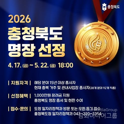 시민행정신문 강갑수 기자 | 충북도는 산업현장에서 최고 수준의 숙련기술을 보유한 ‘2026년도 충청북도명장’을 선정한다고 17일 밝혔다.