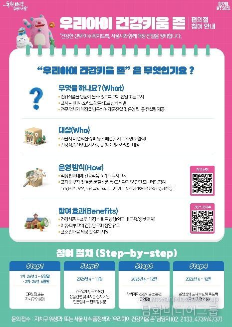 전담관리원은 점검과 함께 ’우리아이 건강키움 존‘ 포스터를 배부하는 등 사업 참여를 적극 안내할 예정이다. 참여를 신청한 업소에는 서울시와 계약한 전문업체가 방문해 건강식품 우선 진열과 표지물 설치를 지원한다.