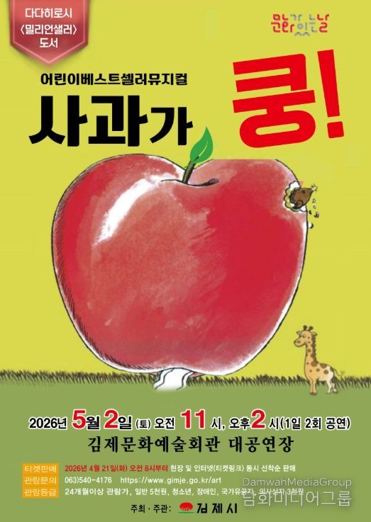 시민행정신문 강갑수 기자 | 동화 속 세상이 무대위로 뿅~ 베스트셀러이자 스테디셀러인 동화를 각색해 만든 어린이 뮤지컬 <사과가 쿵!~>이 오는 5월 2일 오전 11시, 오후 2시 김제문화예술회관 대공연장에서 펼쳐진다.