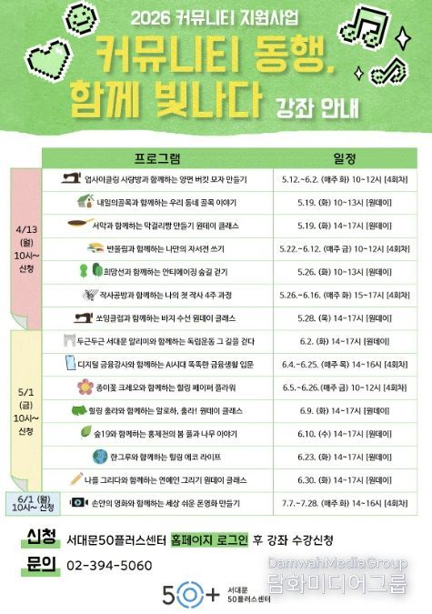 시민행정신문 강갑수 기자 | 서대문구가 운영하는 서대문50플러스센터가 중장년의 자기 계발과 사회참여를 지원하는 교육 프로그램 ‘커뮤니티 동행, 함께 빛나다’를 센터 내 강의실과 야외 현장에서 5∼7월 운영한다.