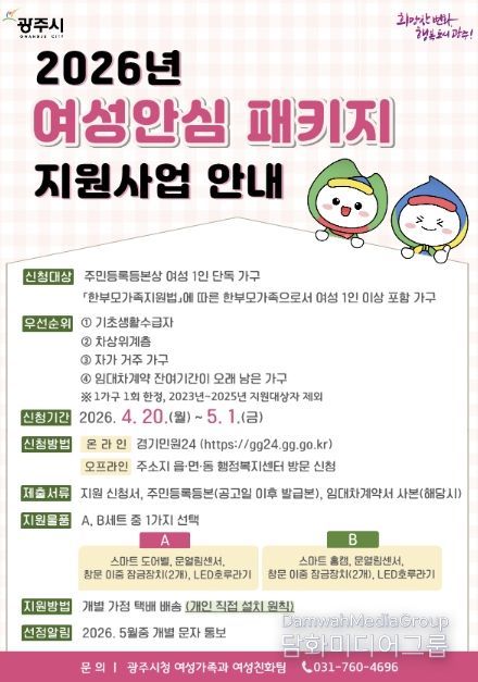 시민행정신문 강갑수 기자 | 광주시는 여성 1인 가구와 한부모가족의 생활 안전 강화를 위해 ‘여성 안심 종합 지원사업’ 대상자 35가구를 오는 20일부터 5월 1일까지 모집한다고 17일 밝혔다.