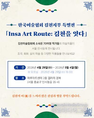 시민행정신문 기자 | 김천시는 4월 29일부터 5월 4일까지 6일간 서울 마루아트센터 2층 갤러리 경북에서 한국미술협회 김천지부 특별전 ‘인사 아트 루트(Insa Art Route): 김천을 잇다’를 개최한다고 밝혔다.