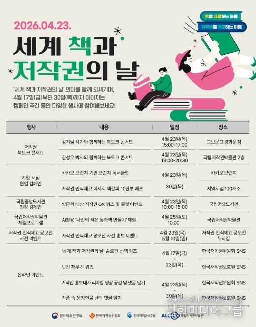 시민행정신문 이존영 기자 | 문화체육관광부는 한국저작권위원회, 한국저작권보호원과 함께 ‘세계 책과 저작권의 날’을 맞이해 4월 17일부터 30일까지 ‘저작권 보호 캠페인’을 추진한다. 이를 통해 책과 저작권이 지닌 소중한 가치를 되새기고, 창작자의 권리를 존중하는 문화를 국민 일상에 확산할 계획이다.