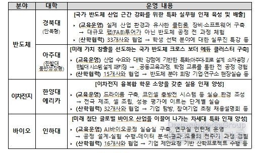 ‘첨단산업 특성화대학 재정지원사업’은 첨단산업 성장에 발맞춰, 분야별 특화 인재양성을 위한 특성화대학을 집중 육성하는 사업이다. 2023년 반도체 분야에서 시작하여 이차전지, 바이오 분야로 확대했으며, 2026년에는 피지컬 인공지능(AI) 시대 차세대 기술 주권 확보를 위하여 로봇 분야를 신설했다.