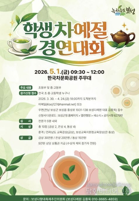 대회는 5월 1일 오전 9시 30분부터 보성군 한국차문화공원 주무대에서 열리며, 초등부와 중·고등부 2개 부문으로 나눠 진행된다.