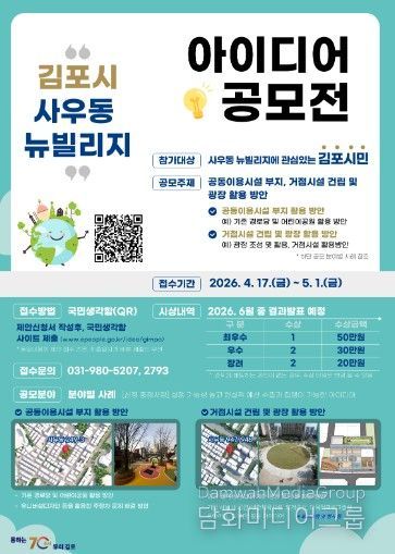 시민행정신문 강갑수 기자 | 김포시가 사우동 뉴빌리지 사업의 일환으로 원도심에 새로운 활력을 불어넣기 위해 ‘2026 사우동 뉴빌리지 시민 아이디어 공모전’을 개최한다고 밝혔다.