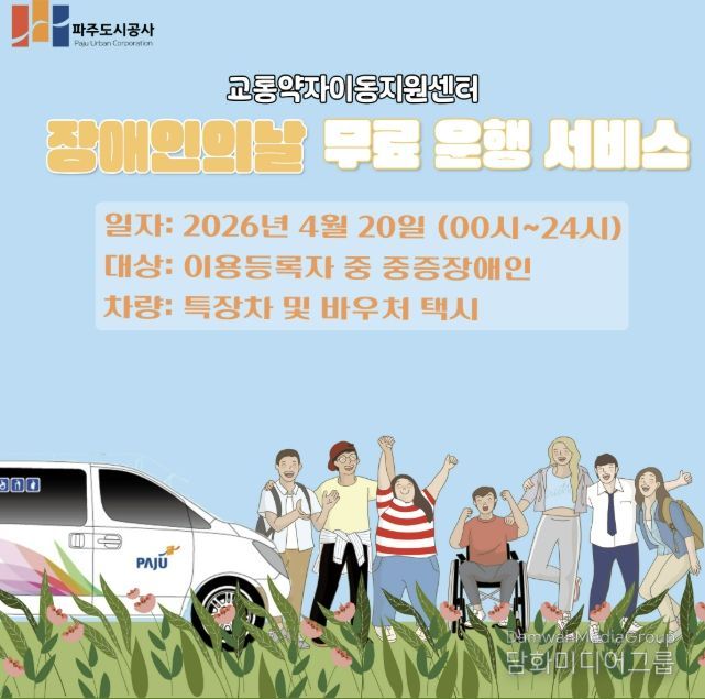 시민행정신문 강갑수 기자 | 파주도시공사 교통약자이동지원센터에서는 오는 4월 20일 장애인의 날을 맞아 교통약자를 위한 무료 운행 서비스를 실시한다.