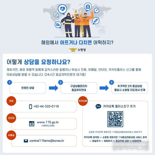 시민행정신문 강갑수 기자 | 홍성소방서는 해외에서 예기치 못한 질병이나 부상 발생 시 신속한 대응을 돕기 위해 ‘재외국민 119응급의료 상담서비스’ 이용을 홍보한다고 밝혔다.
