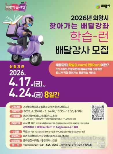 시민행정신문 강갑수 기자 | 의왕시가 시민이 원하는 시간과 장소에 강사를 파견하는 맞춤형 평생학습 서비스인‘2026년 찾아가는 배달 강좌 학습-런(Run)’사업에 활동할 역량 있는 시민을 모집한다.