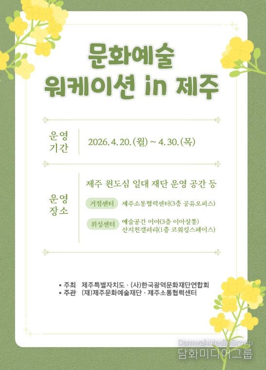 시민행정신문 기자 | 제주특별자치도와 한국광역문화재단연합회가 주최하고 제주문화예술재단(이사장 김석윤)이 주관하는 2026년 ‘문화예술 워케이션 in 제주’ 1차 프로그램이 오는 20일부터 4월 30일까지 운영된다.